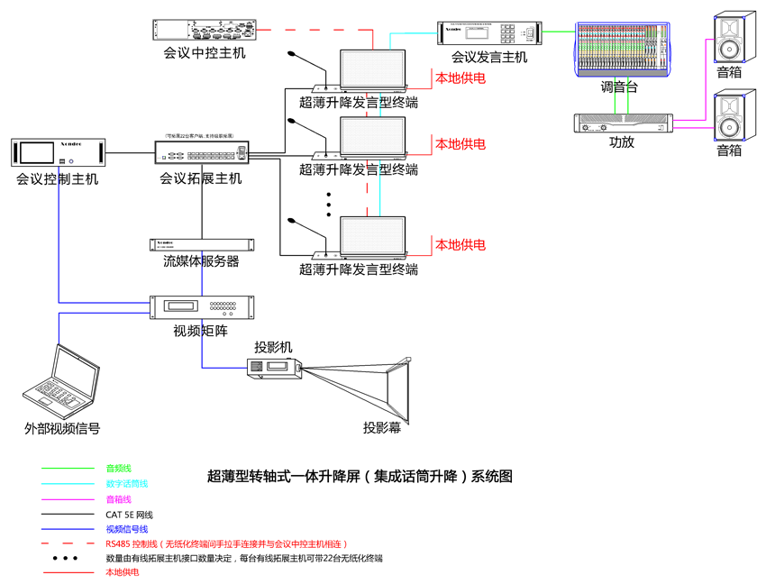 3、系統可(kě)以擴展第三方網絡中控,從(cóng)而實現(xiàn)任意會(huì)議(yì)終端(經過授權)随時(shí)對(duì)周邊設備進行☆(xíng)控制(zhì);第三方中控可(kě)通(tōng)過RF/RS 485協議(yì)對(duì≠)升降進行(xíng)統一(yī)控制(zhì)。