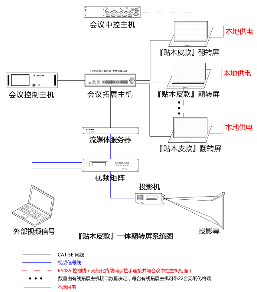 1、系統拓撲結構簡單,所有(yǒu)桌牌顯示、同步數(shù)據、文(wén)稿、視(shì)頻(pín)統一(yī±)走局域網,實現(xiàn)了(le)純數(shù)字純網線的(de)組網連接,極大(dà)降低(dī)了(le)施工(gōng)複雜(zá)度♥,提高(gāo)了(le)系統穩定性和(hé)可(kě)維護性。