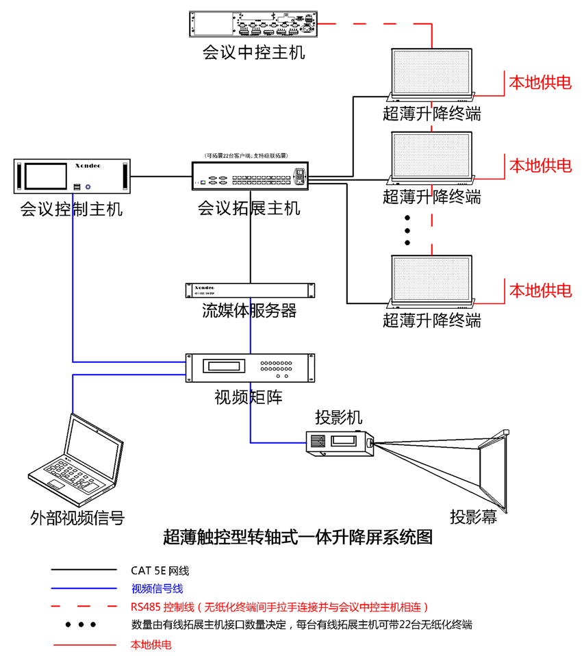 3、系統可(kě)以擴展第三方網絡中控,從(cóng)而實現(xiàn)任意會(huì)議(yì)終端(經™過授權)随時(shí)對(duì)周邊設備進行(xíng)控制(zhì);第三方中控可(kě)通(tōng)過RF/RS 485協∞議(yì)對(duì)升降進行(xíng)統一(yī)控制(zhì)。