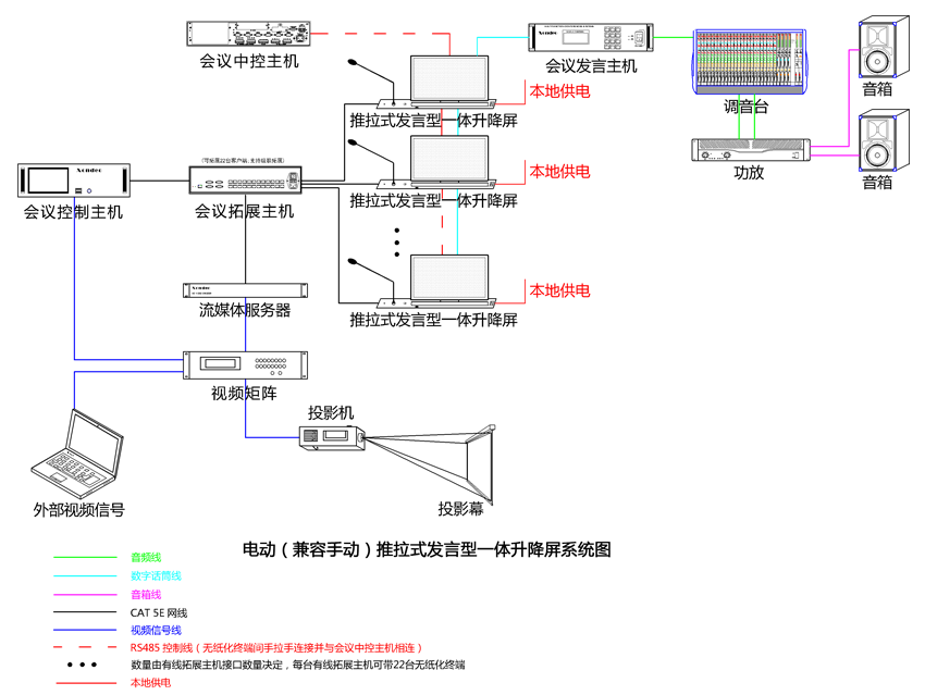 3、系統可(kě)以擴展第三方網絡中控,從(cóng)而實現(xiàn)任意會(huì)議(yì)終端(經過授權)随時(shí)對(duì)周邊設備進行(xíng)控制(zhìα);第三方中控可(kě)通(tōng)過RF/RS 485協議(yì)對(duì)升降進行(xíng)統一(yī)控制(zhì)。